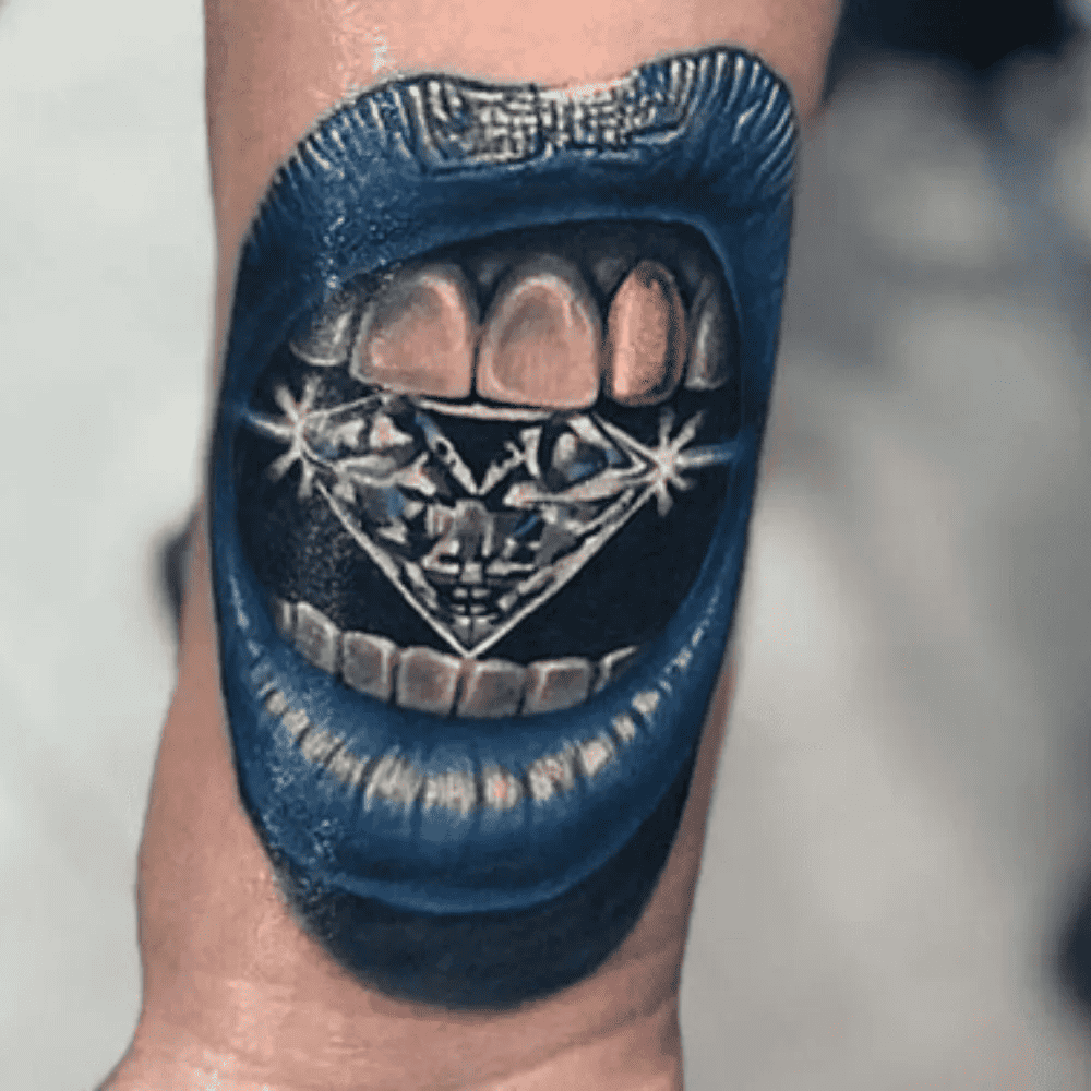 The sheer beauty of the diamond alone would suffice for an extraordinary tattoo. However, this individual has gone the extra mile by including the mouth, resulting in a breathtaking body art that commands admiration.