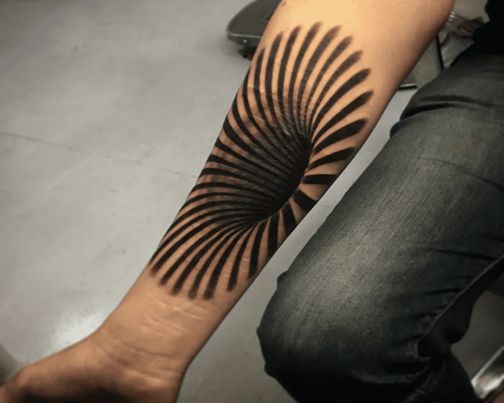 Prepare to be astounded by the next tattoo in our lineup. The lines within this tattoo create the illusion that they are vanishing into an all-consuming black hole, seamlessly integrated into the design in a manner that suggests they are passing straight through the person’s arm. It’s so convincingly executed that you might find yourself tempted to reach out and try to stick a finger through it.
