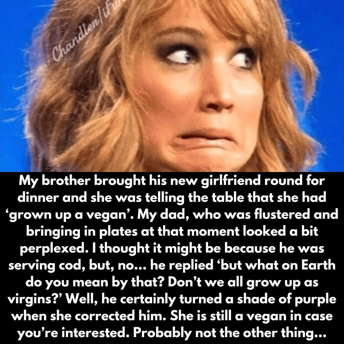 So, this girl casually mentioned that she was a vegan and had been one since childhood. This led to a few uncomfortable moments of silence as the guy’s dad tried to make sense of the statement. Well, maybe the first meeting didn’t go as smoothly as expected, but at least they now share this hilarious story!