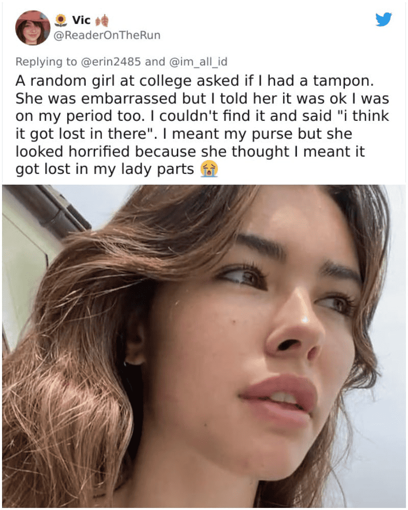 I’m going to assume that the random girl’s brain was momentarily delayed because there’s no way she would have expected Vic to hand her a used tampon. Hopefully, they had a good laugh once the misunderstanding was cleared up. Still, I feel sorry for both of them if neither had a tampon on hand; that’s a recipe for a challenging day!
