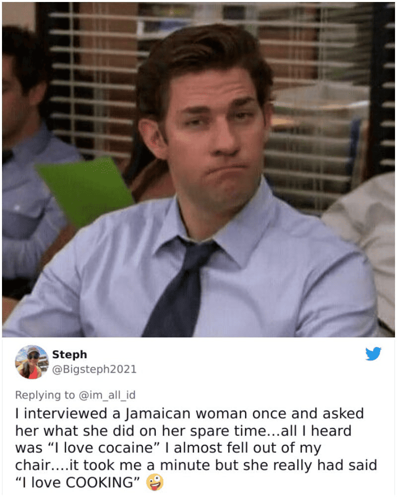 I bet this one tops the list of all the things Steph has heard at an interview. Thankfully, they got it straightened out pretty quickly. I’m here hoping she even offered to cook some yummy Jamaican food for lunch one day after she got the job.