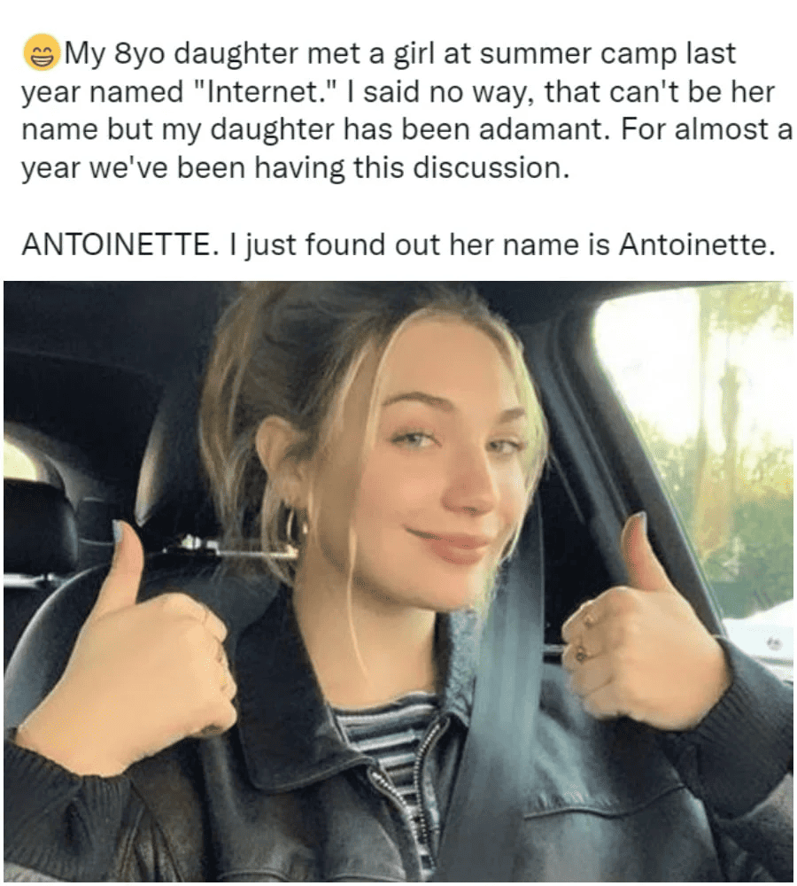Unsurprisingly, this little girl heard “Internet” rather than “Antoinette.” She’s a young girl living in 2022 – she’s familiar with the Internet and has probably never heard the name Antoinette before. It’s not unheard of, but it’s a pretty old name, and you won’t meet many young girls named Antoinette these days.