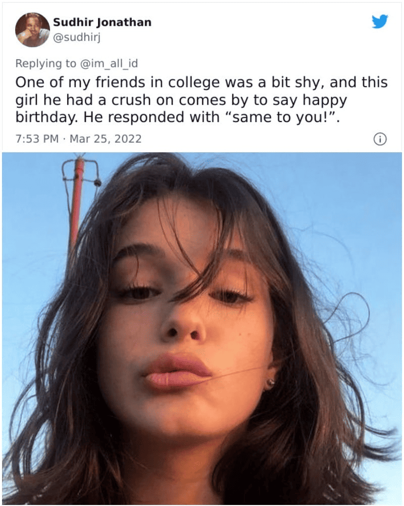 Also, she knew it was his birthday, so maybe his crush wasn’t unrequited. The real question here is whether or not she giggled after he said it. It’s all about the body language and tone of the response, gentlemen. Take note and go forth with this new knowledge.