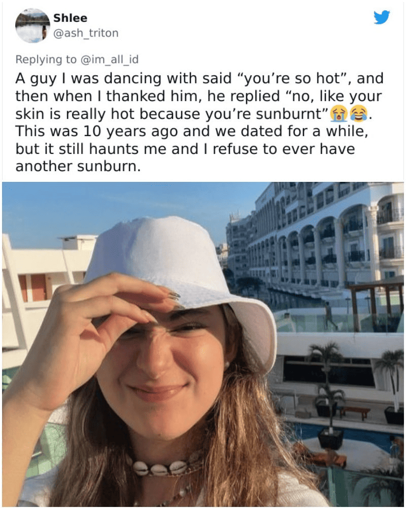 Trust me. I’m an expert. I live in the South, and my husband constantly pulls this one on me. It may or may not be why I married him. He’s super cheesy sometimes. Anyway, Shlee, now you know. At least this guy did you one favor. Sunburns are bad for your skin. Hopefully, you’re using sunscreen, still living your best life, and not hiding out on sunny days!