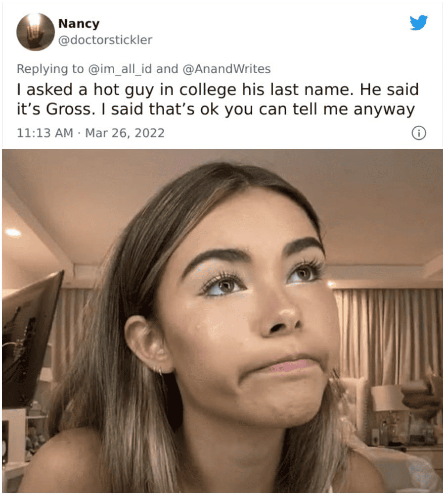 According to the vast realm of online information, Gross is a surname of Prussian, German, and Yiddish origin, meaning big, tall, or great. It’s not an entirely uncommon name, even in the United States. Unfortunately, in America, it just means… gross. I can see why Nancy was utterly baffled. Dating Mr. Gross would require quite an adjustment.