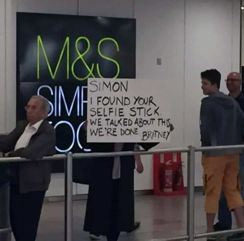 This is what happens when you’re too obsessed with your face. Simon’s girlfriend had enough of his vanity and decided to shame him publicly with a sign. Whether it was a joke or not, Britney’s sign caught the attention of all arriving passengers.