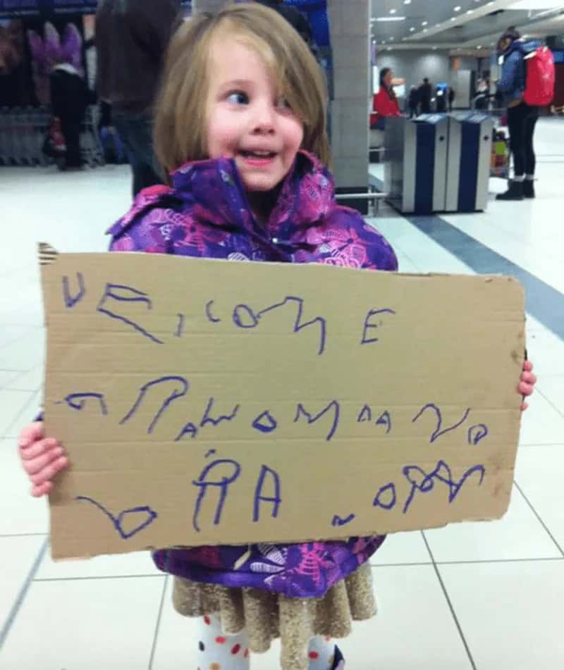 This sign came from the heart of a child. If you can’t read it, try imagining yourself as a child and rearrange the letters. The sweet little girl made this handwritten sign to welcome her grandparents home at the airport, and it surely melted their hearts.