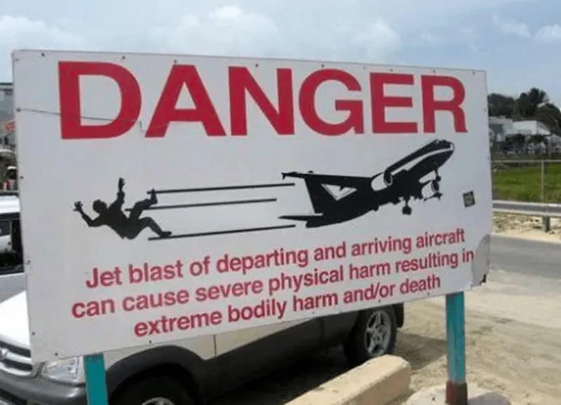 This sign at a New Zealand airport warns of parking near the runway. Arrivals should park quickly and go inside to avoid jets taking off or landing. For safety, consider taking a taxi directly to the terminal.