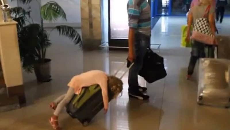Who can blame the little girl for resting her tired feet on Dad’s luggage? Her slumped posture mirrors the fatigue of airport passengers enduring long waits for everything, even the bathroom. When the body needs rest, it should take it, even on the move.