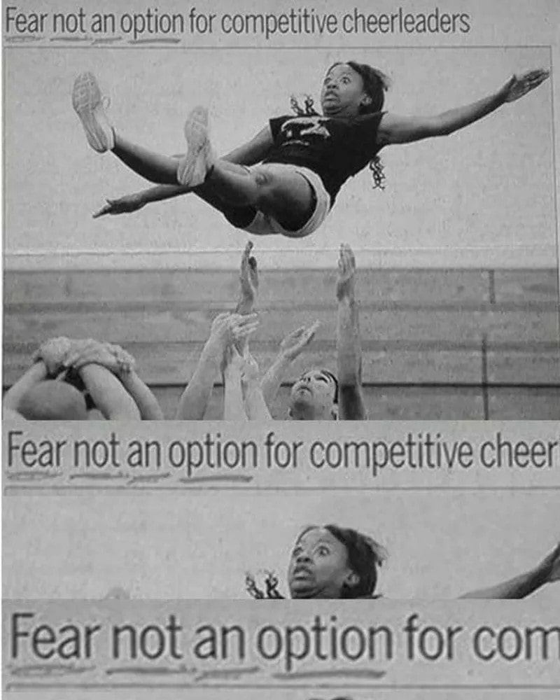 In this specific poster, the focus does not lie on any performance-related mistake made by the cheerleader; instead, it centers on the choice of photo to convey a particular message. While she undoubtedly exhibits determination and resolve in her actions, the portrayal of fearlessness might not be as evident. Nevertheless, her decision to confront and conquer any apprehensions is undeniably commendable.