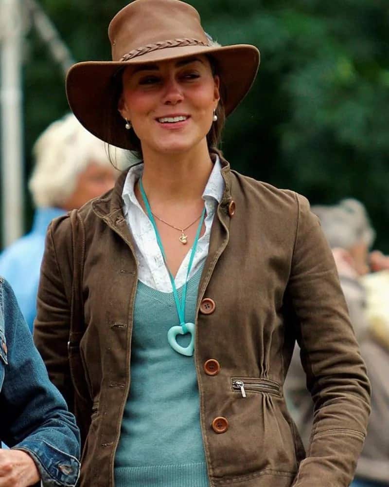 This look is eclectic, with Kate donning a shirt, vest, jacket, and blue jeans, all capped off with a cowboy hat. Her accessories include a large heart-shaped necklace and a smaller accompanying one.