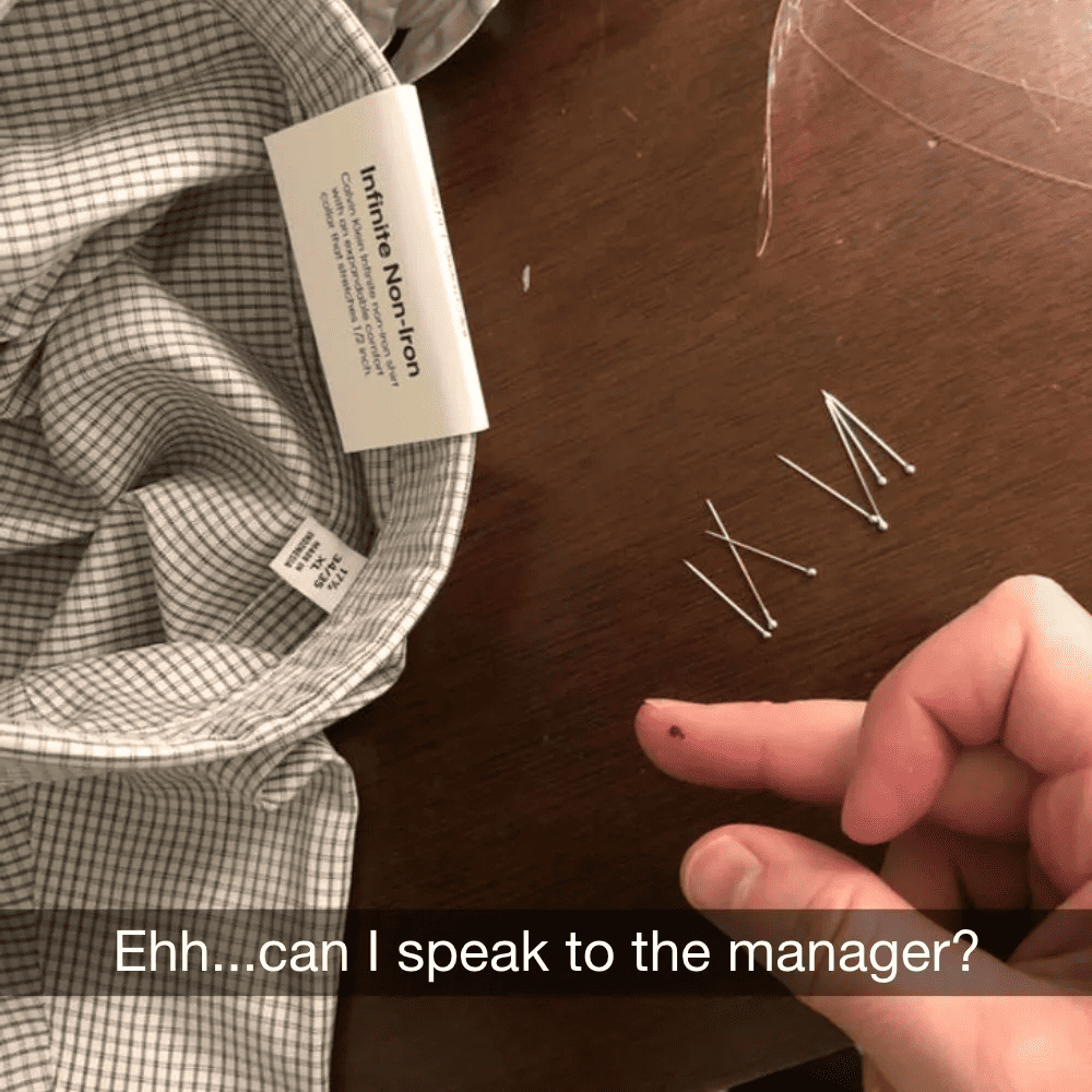 Alternatively, the owner might have tried on the new shirt and had it expertly tailored for a perfect fit, only to leave the store unknowingly adorned with a hazardous collection of pins. Ouch!