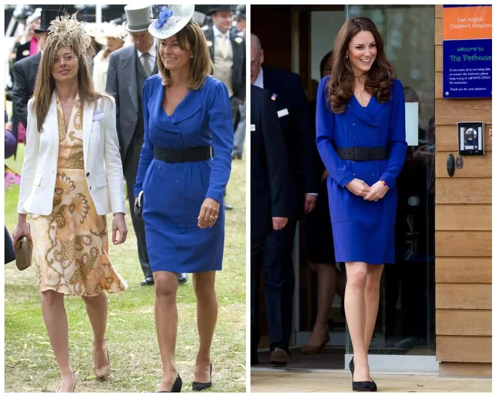Royal fashion recycling goes both ways. In 2010, before Prince William and Kate Middleton were even engaged, Kate’s mother, Carole Middleton, made a stylish appearance on the final day of Royal Ascot in a cobalt-blue belted dress paired with black pumps.
