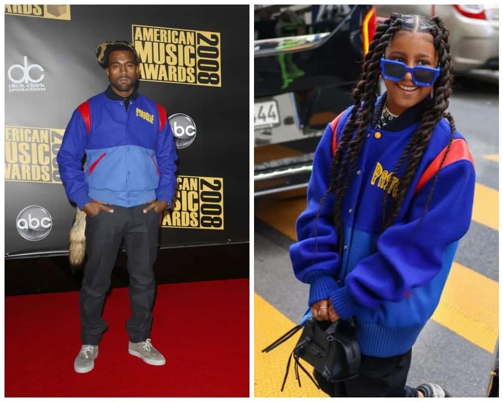 It’s not only mothers who share their clothing with their daughters. Kanye West lent his daughter his famous $100,000 Pastelle jacket for a shopping excursion in Paris with her mother, Kim Kardashian. The rapper originally sported the vibrant blue jacket at the 2008 American Music Awards, complete with a sideways hat, gray suede shoes, and a tail!