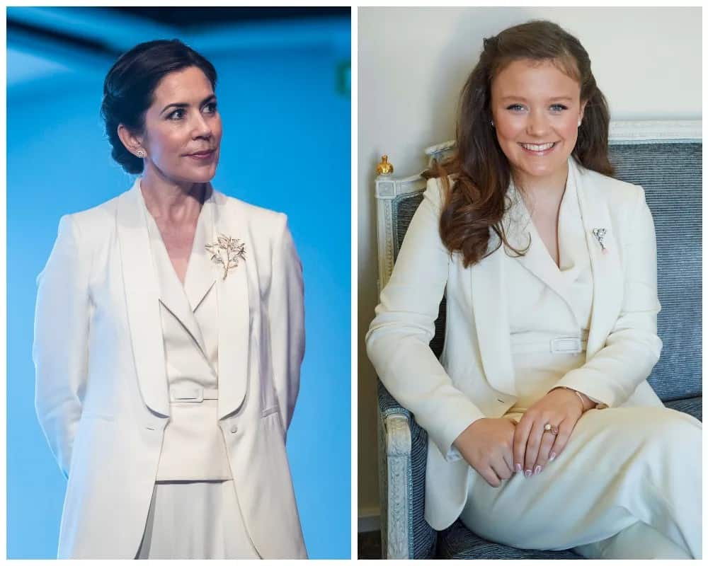 Fifteen-year-old Isabella wore the same blazer and trouser suit for her confirmation, adding her unique touch with a diamond and pearl pink pearl brooch gifted to her by her grandmother, Queen Margrethe, on her Christening day.