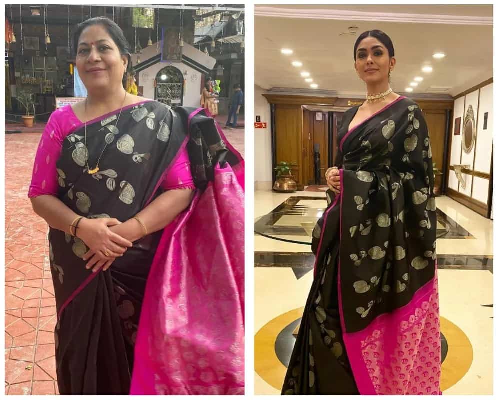 The tradition of mothers and daughters sharing clothes is not limited to the West. Indian actress Mrunal Thakur shared a side-by-side comparison of her mother, Vandana Thakur, elegantly adorned in her black sari with a rani pink pallu on Instagram.