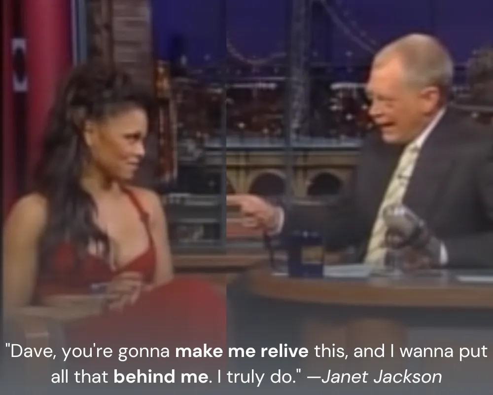 In a particularly audacious moment, when Janet expressed her desire to move on from discussing the Super Bowl incident, David Letterman retorted, “Well, not me!” This exchange highlighted the insensitivity of some interviewers who prioritize sensational topics over their guests’ comfort and boundaries, leaving Janet Jackson visibly distressed during the interview.