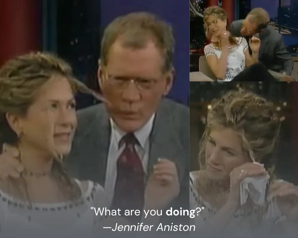In the annals of cringe-worthy interview moments, one between Jennifer Aniston and David Letterman during an episode of The Late Show in 1998 stands out as particularly bizarre and uncomfortable. As the conversation unfolded, it took an abrupt and unsettling turn when David Letterman, seemingly out of the blue, scooted closer to Jennifer Aniston and remarked that he “just want[ed] to try one thing.” What followed was a moment of sheer weirdness as he held her head in place and placed a strand of her hair in his mouth. Jennifer, understandably bewildered and uncomfortable, tried to pull away while attempting to laugh off the inexplicable situation.