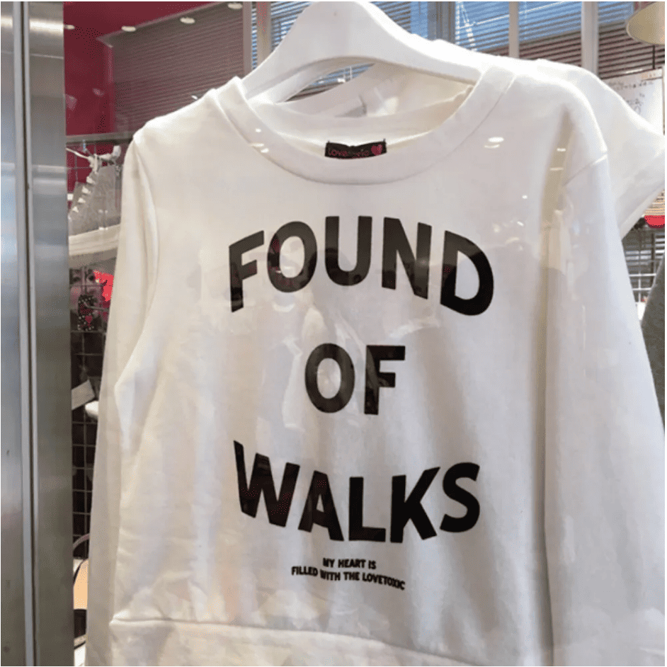 We can only assume that this shirt was supposed to say “fond of walks.” Someone found either that or the t-shirt while they were on a walk.