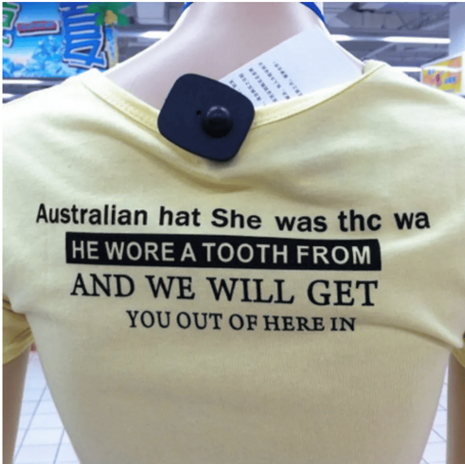 Interpreting the message on this shirt is a bit like solving a cryptic puzzle, but we’ll put on our figurative English Lit professor hats and give it a shot. The first line describes a woman who proudly dons a hat from Australia, indicating her worldly fashion sense. Moving on to the second line, it introduces a male character who sports a shark tooth necklace, reminiscent of early 2000s fashion trends. The final two lines suggest a narrative of one of them coming to the rescue of the other, adding an element of intrigue to the story.