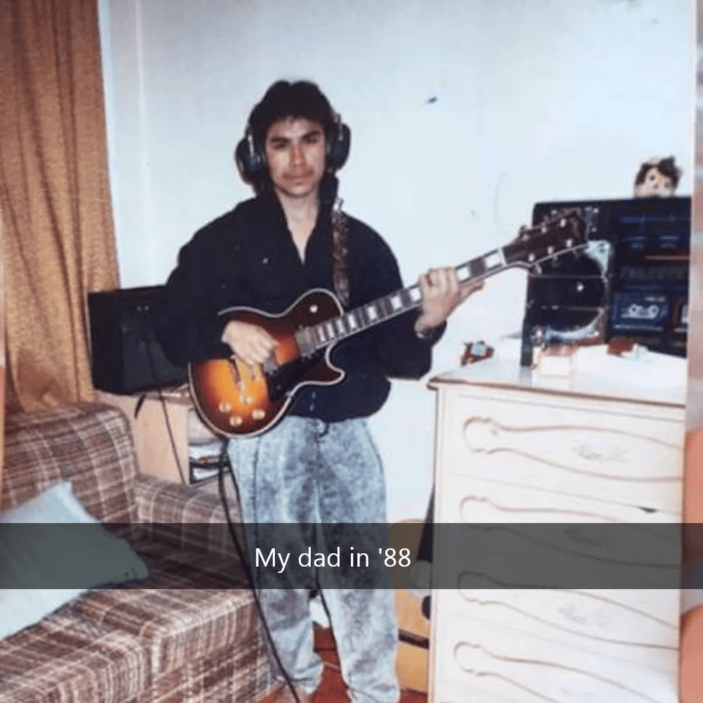 Yes, indeed, it was the ’80s. One glance at this picture, and there’s no mistaking it—an ’80s dad in all his glory. The hairstyle, the fashion choices, the guitar—an ’80s chorus that resounds loudly and proudly. This dad exudes rock ‘n’ roll coolness, seemingly the king of cool back in the day.