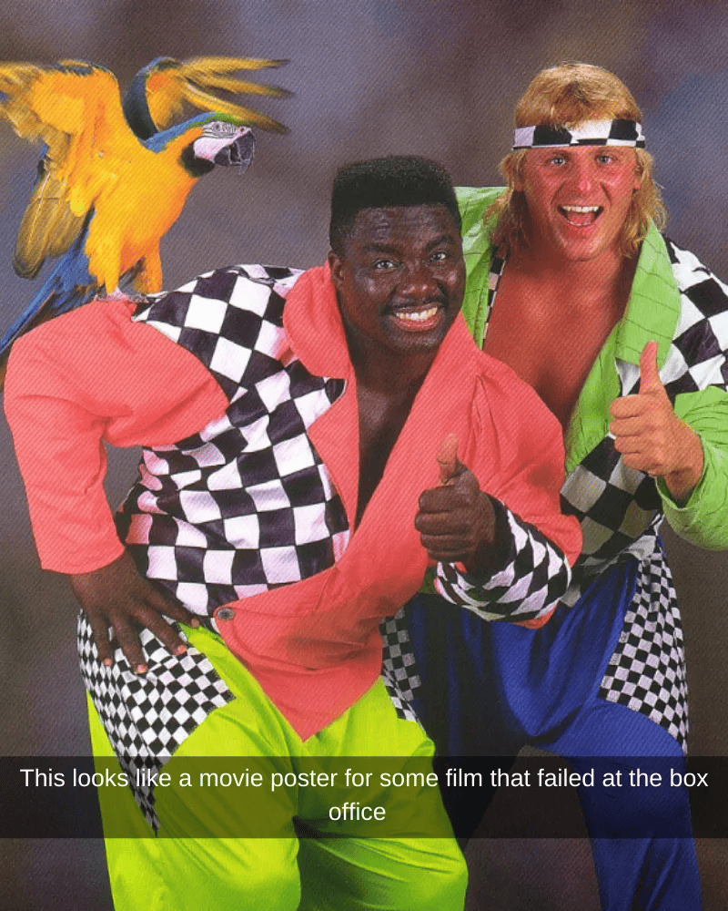 You know your costume is excessively loud and bright when it seamlessly blends in with a parrot… These two gentlemen from the ’80s appear so multicolored that we had to take breaks while examining this picture. Our eyes started to hurt after staring at the screen for too long.