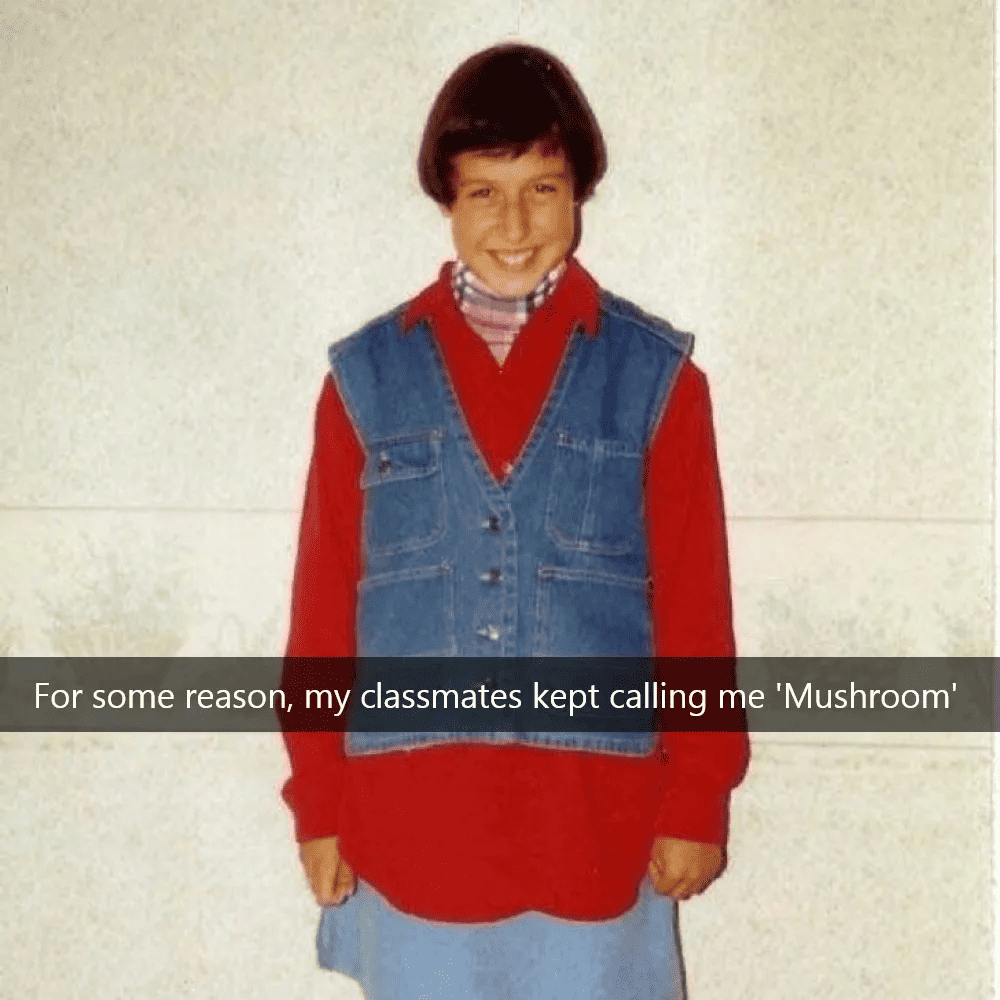 In fashion and style, the ’80s were notorious for pushing boundaries and experimenting with unconventional looks. This photograph showcases a young woman whose hairstyle has earned her the affectionate nickname “Mushroom.” With her distinct hair, she bears an uncanny resemblance to actress Mayim Bialik.