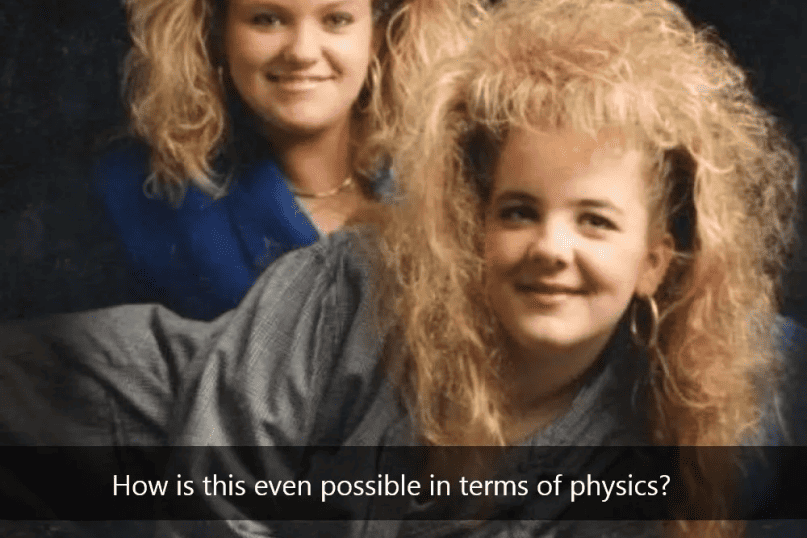 The most striking feature of this image is the hairstyles of the individuals involved, which are teased and styled to such towering heights that they seem to challenge the laws of gravity, striving to escape Earth’s gravitational pull. As we contemplate this peculiar image, it becomes clear that sometimes, the ’80s had a way of creating fashion moments that left us speechless, with no need for further explanation.