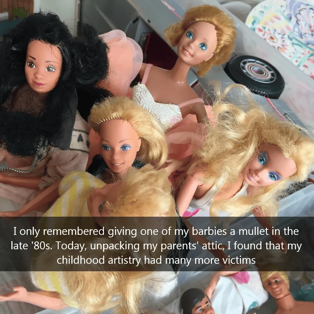 In this snapshot, a collection of Barbie dolls proudly showcases their mullet hairstyles. This discovery is even more astonishing because the Snapchatter who shared this image only remembered giving one of these dolls a mullet. As she delved into her parents’ attic and stumbled upon these Barbies, she couldn’t help but be taken aback by the horrors of her childhood artistry.