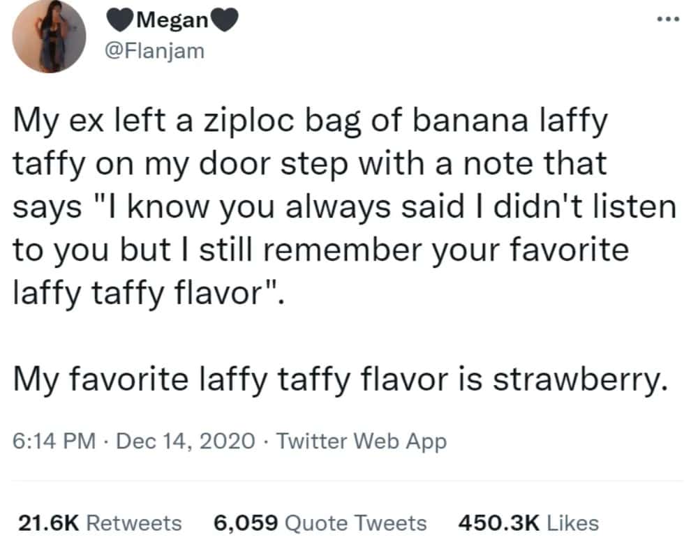 Now faced with the absence of a familiar and beloved quirk, the question arises: what should they do with all that banana Laffy Taffy they once shared? It’s a humorous reflection on how the smallest details of a relationship can leave a lasting impact, even after it has ended, and the remnants of those idiosyncrasies can serve as a bittersweet reminder of what was once shared.
