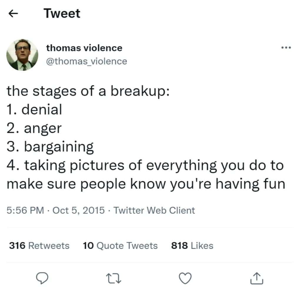 Some things in life seem to follow a general formula, like the well-known model regarding the stages of grief. In this tweet, the user decided to adapt this formula to outline the stages of a breakup as well.