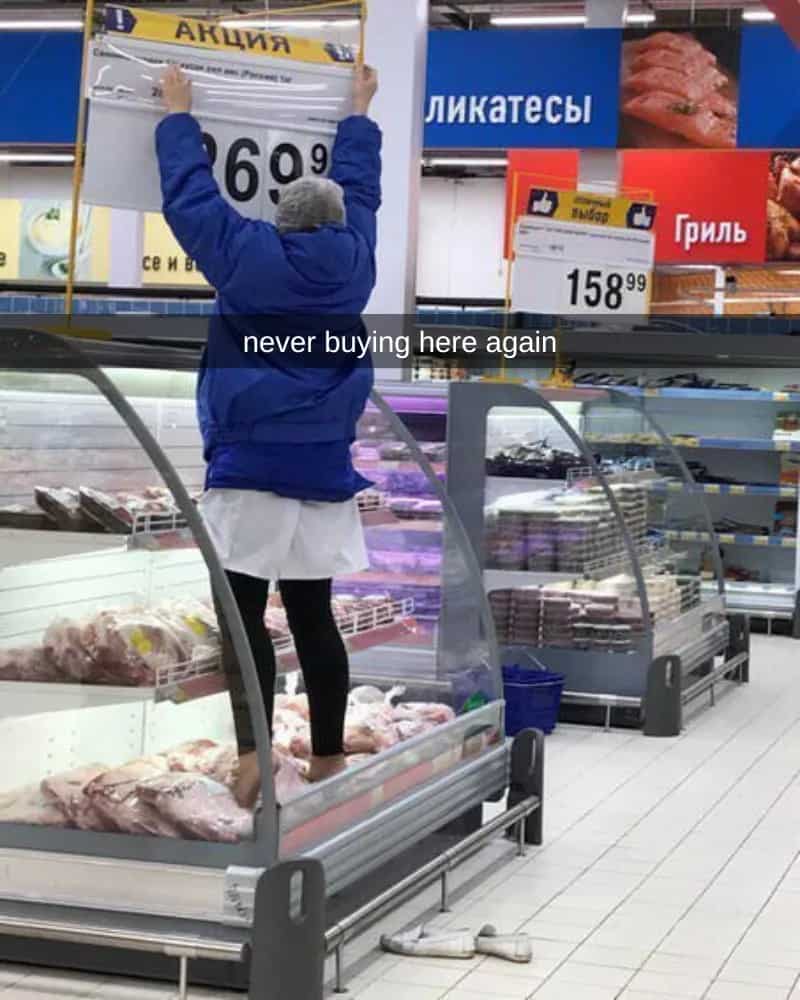 Supermarkets must uphold high standards of hygiene and cleanliness, especially in areas like the meat aisle. However, this image shows an employee disregarding hygiene practices by stepping on food items. Such behavior not only violates health and safety regulations but also raises concerns about the store’s commitment to quality.