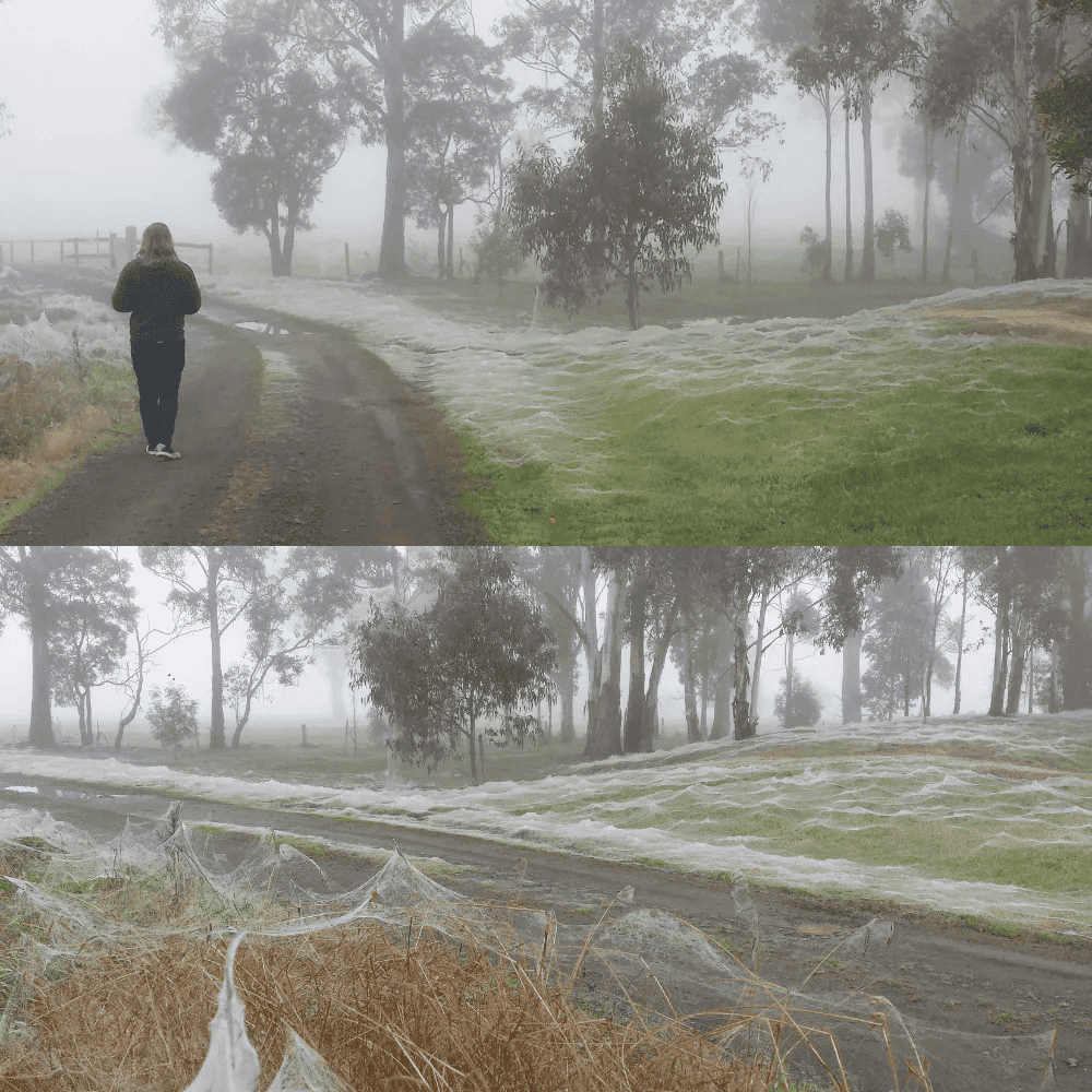 The phenomenon you described, resembling frost over a park, is not frost but rather an intriguing occurrence related to spiders in Australia. During the country’s rainy seasons, spiders construct extensive webs that create expansive clusters in the vegetation.