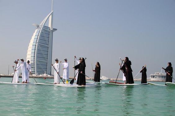 The ladies depicted bravely paddleboarding while adorned in their traditional clothing, symbolizing their unwavering commitment to their cultural roots even as they engage in contemporary recreational activities.