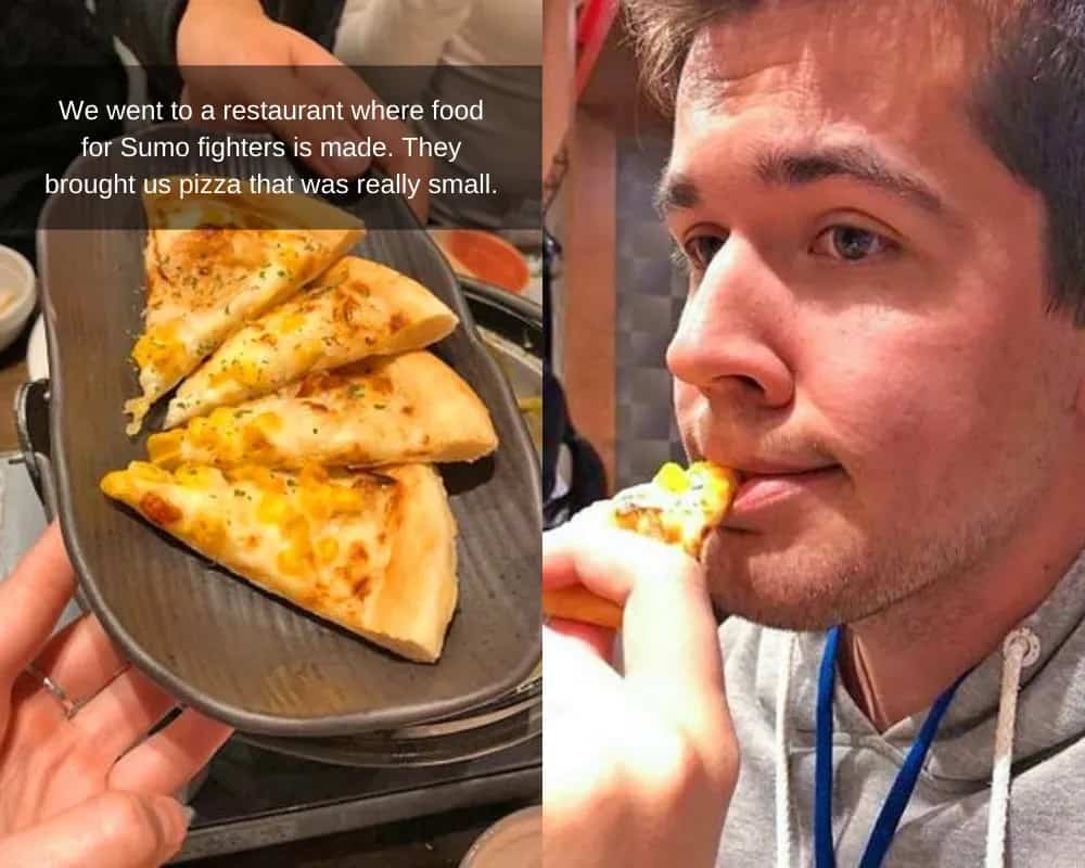 Sumo wrestlers, called Rikishi, consider it a mission to build muscle for tournaments since stature and power are essential aspects of the game. However, the pizza found in this restaurant was smaller in size than the normal one.